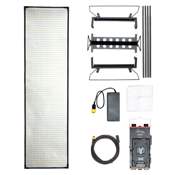 Louer avec un Chimera et un Nid d’abeille (Louver), le BI-FLEX est un panneau d’éclairage flexible de 108x30cm et de moins de 5mm d’épaisseur. Fonctionne sur secteur et autonome sur batterie.